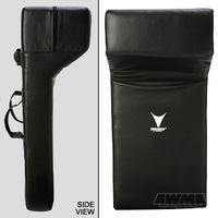There are basically two types of body shields. One type is used much like a traditional military shield. This shield is a curved piece of equipment because the curve helps diffuse the power of the kick. One advantage of this type of body shield is that it can be placed where a punch or kick is going. You can practice a high kick and then a low kick and the body shield can be quickly placed in the right location. This can’t be done with a stationary target. Usually, these body shields come with two straps located at the back, and that’s where the trainer holds the body shields. These straps need to be sturdy and durable in order to withstand the force of repeated blows.