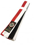 Red and white on one side and solid black on the other. Made of 100% cotton. 8 line stitching. 1-3/4" width. THIS IS A DOUBLE BELT. FOR 4TH & 5TH DEGREE BLACK BELTS